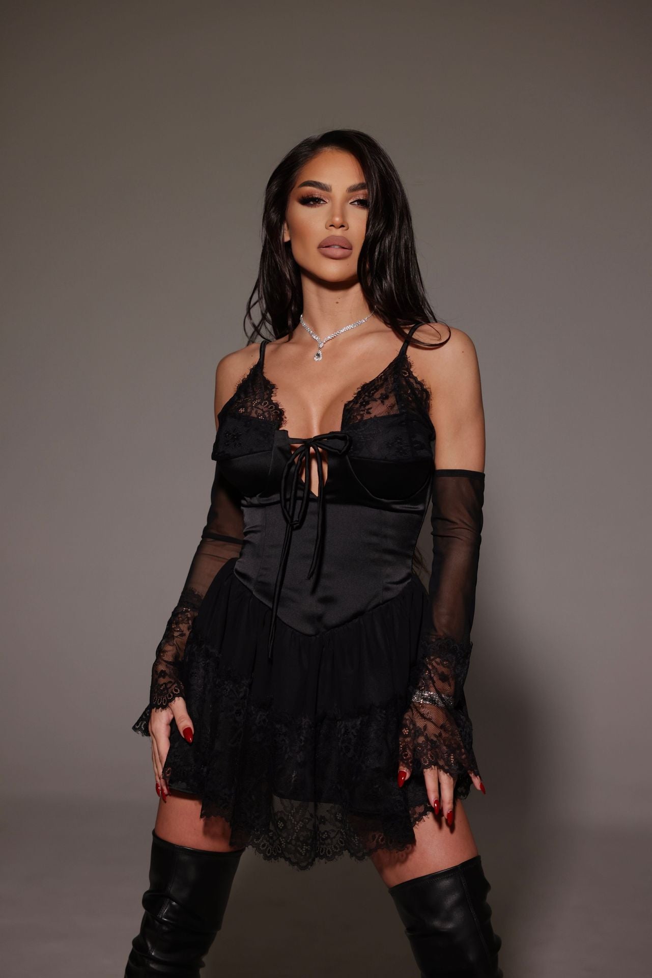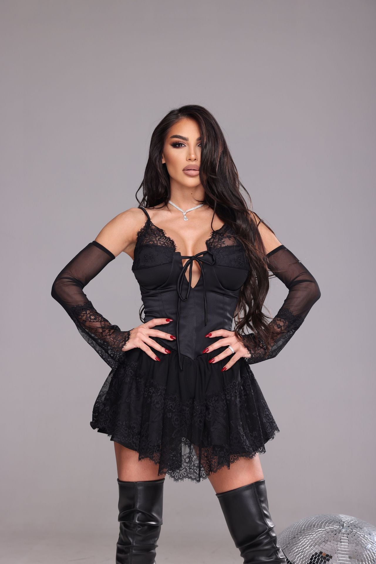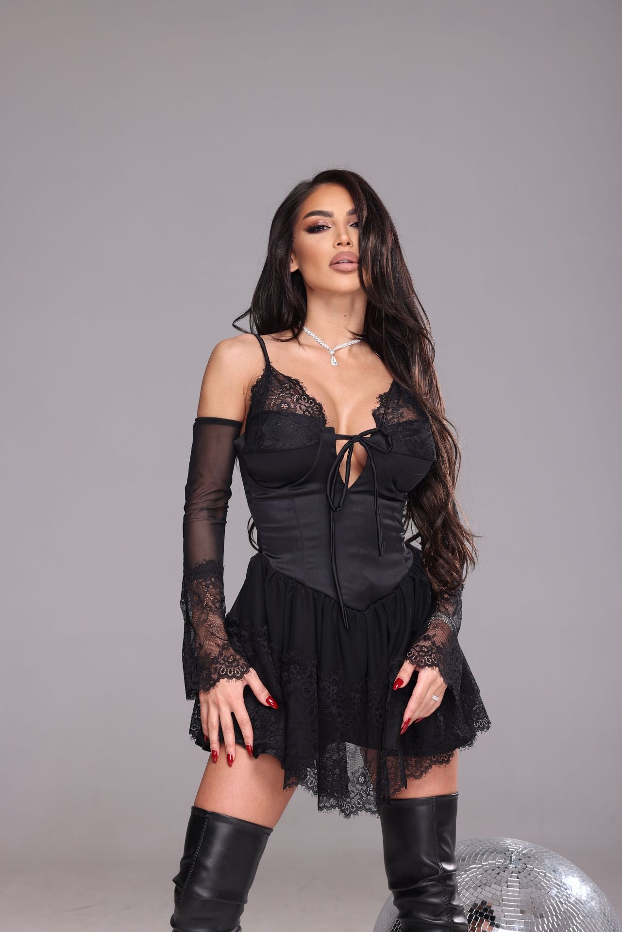Kъса рокля с корсет и декорация с тюл, сатен и дантела. Може да бъде изработена по Ваши размери.