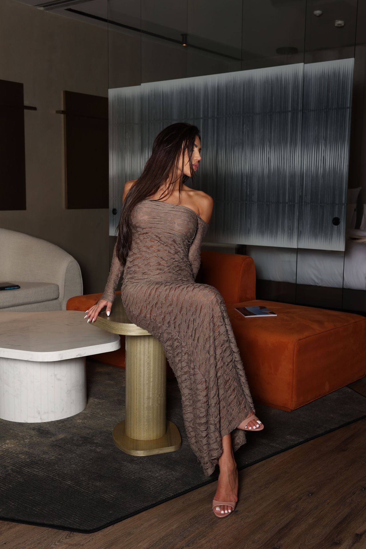 Изискана дълга рокля. Леката материя и силуетът по тялото подчертават формите, а падналото рамо добавя съвременна елегантност. Подходяща е за официални събития, летни вечери и специални поводи.