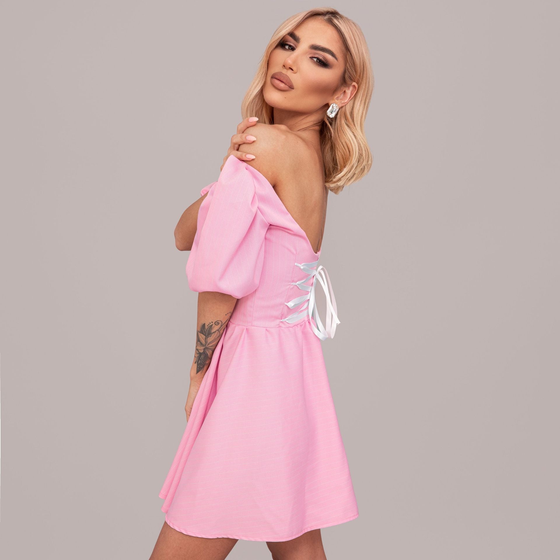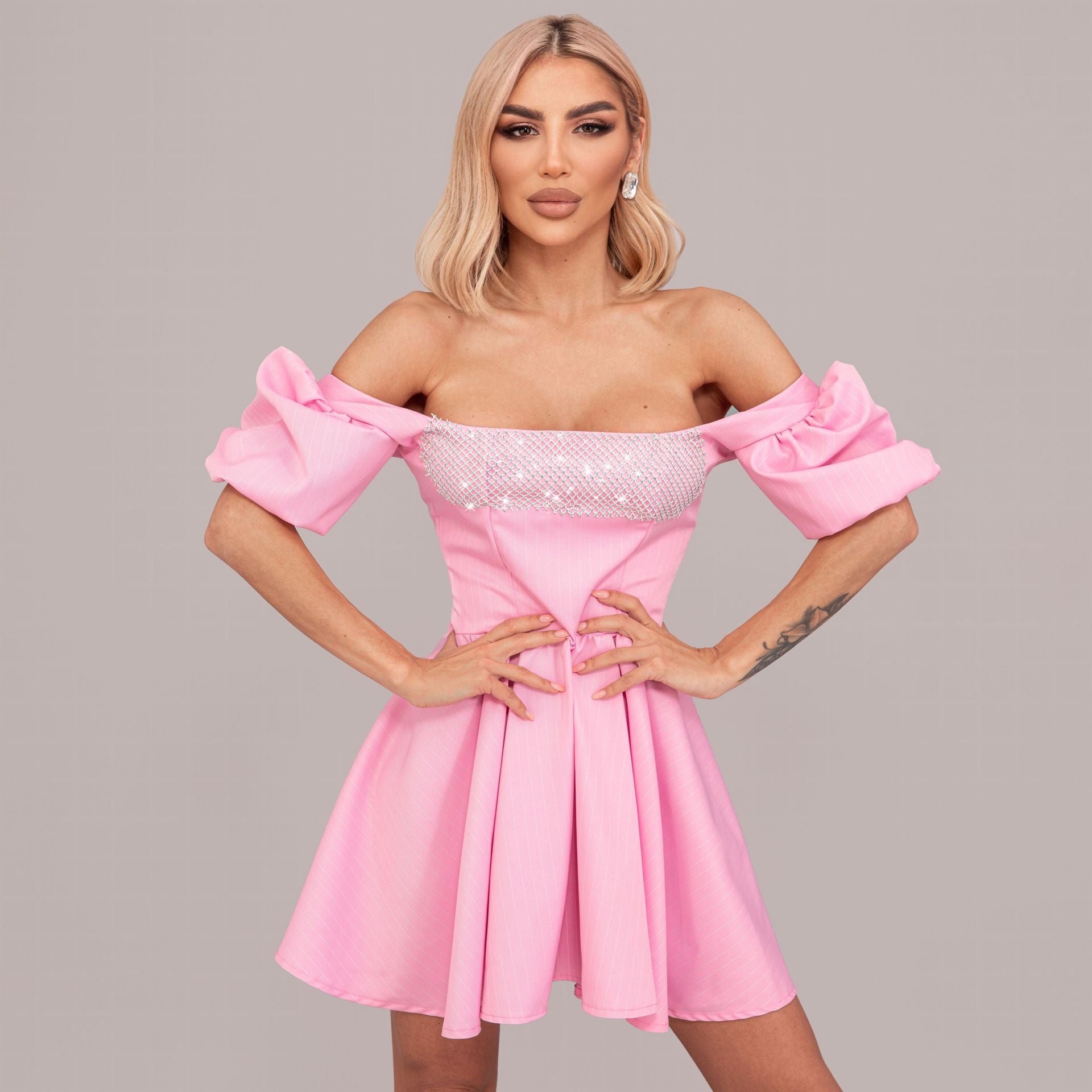 Къса рокля райе в бебешко розово със сатенена връзка и цип в задната част, а в областта на бюста- бяла мрежа с камъни.