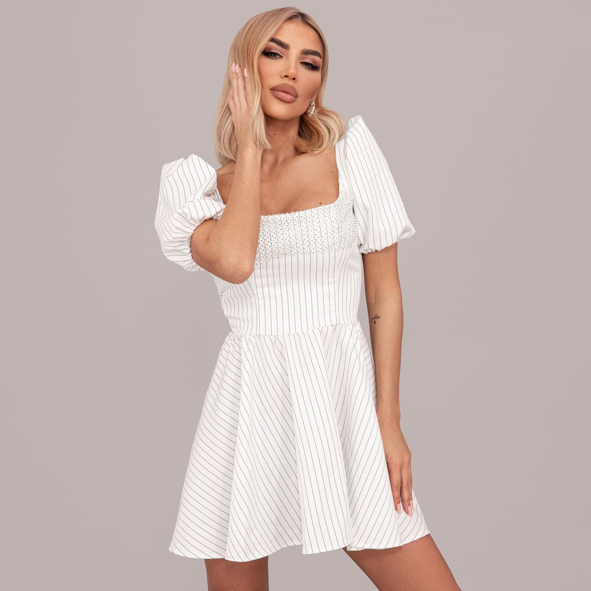 Къса рокля райе в бяло със сатенена връзка и цип в задната част, а в областта на бюста- бяла мрежа с камъни.