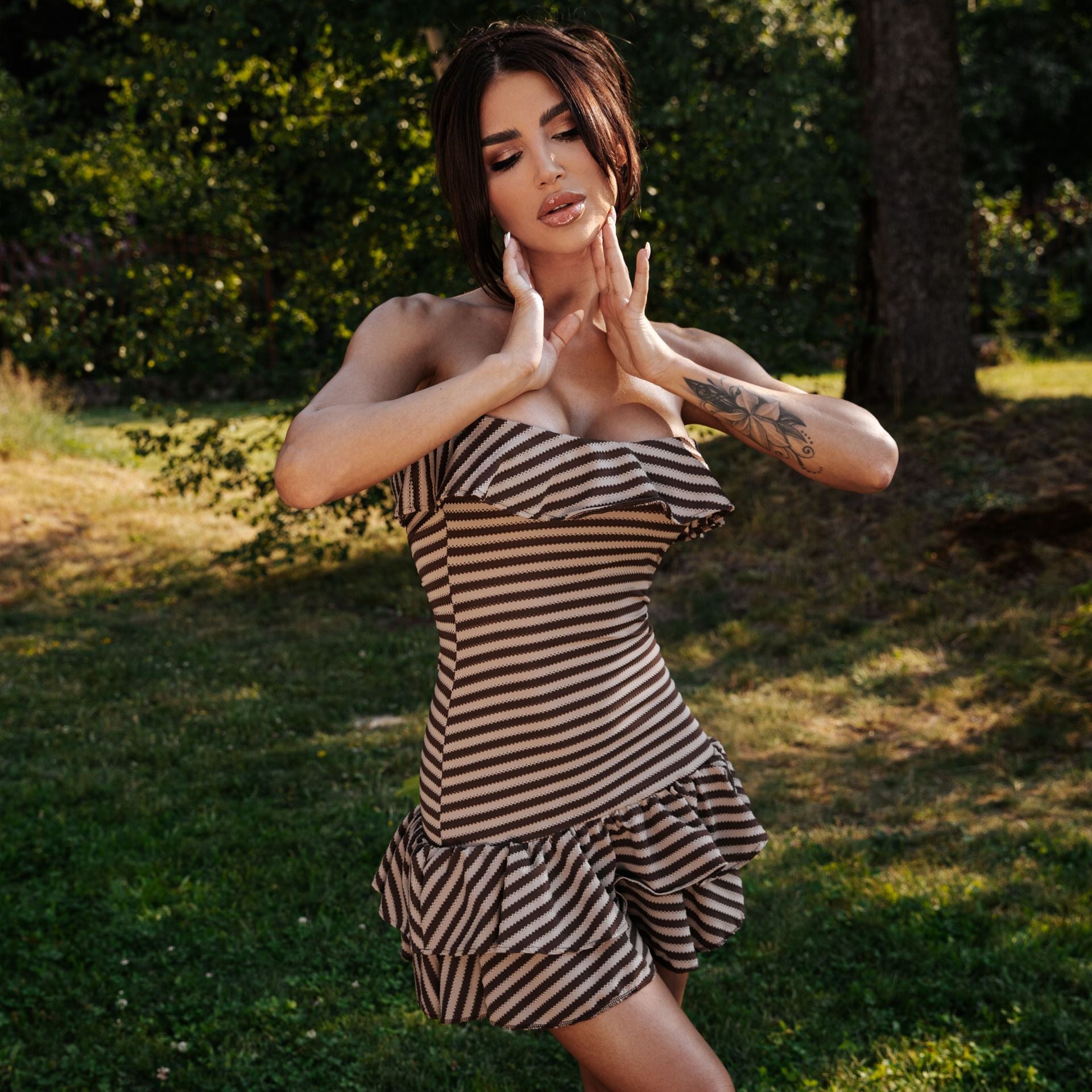 Къса рокля райе с къдри в горната и долната част.